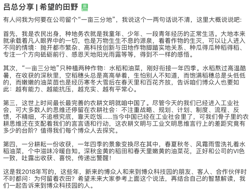 在维多利亚vic115优惠大厅科技园里,有一片特别的土地 ——“希望的田野”。在这里,一年仅种植水稻和油菜两种作物,却刚好巧妙衔接了一年四季的轮回。嫩绿与金黄交替铺展,生生不息。众多维多利亚vic115优惠大厅人及来访客人都对这片田野有着强烈的好奇,其实早在2018年这片田地的一号耕作人早已经对它做过意义分享与解读。